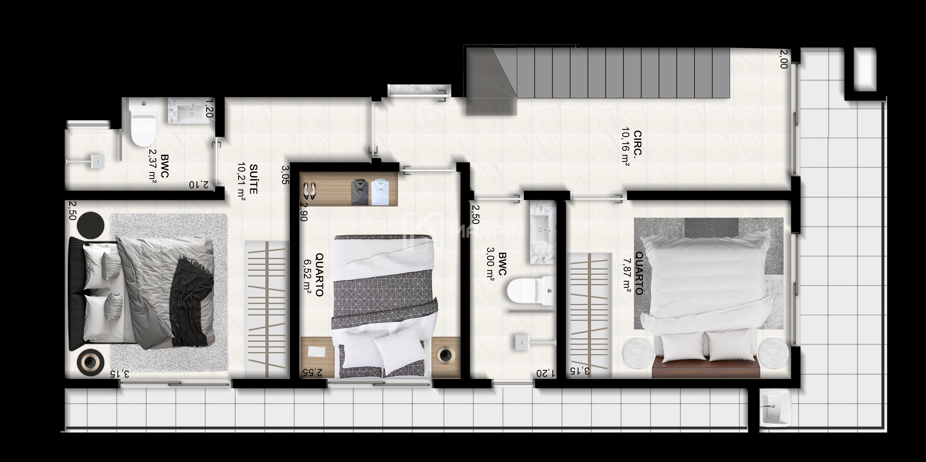 Pavimento Inferior consiste em 02 dormitórios sendo 02 suítes e 01 banheiro social.